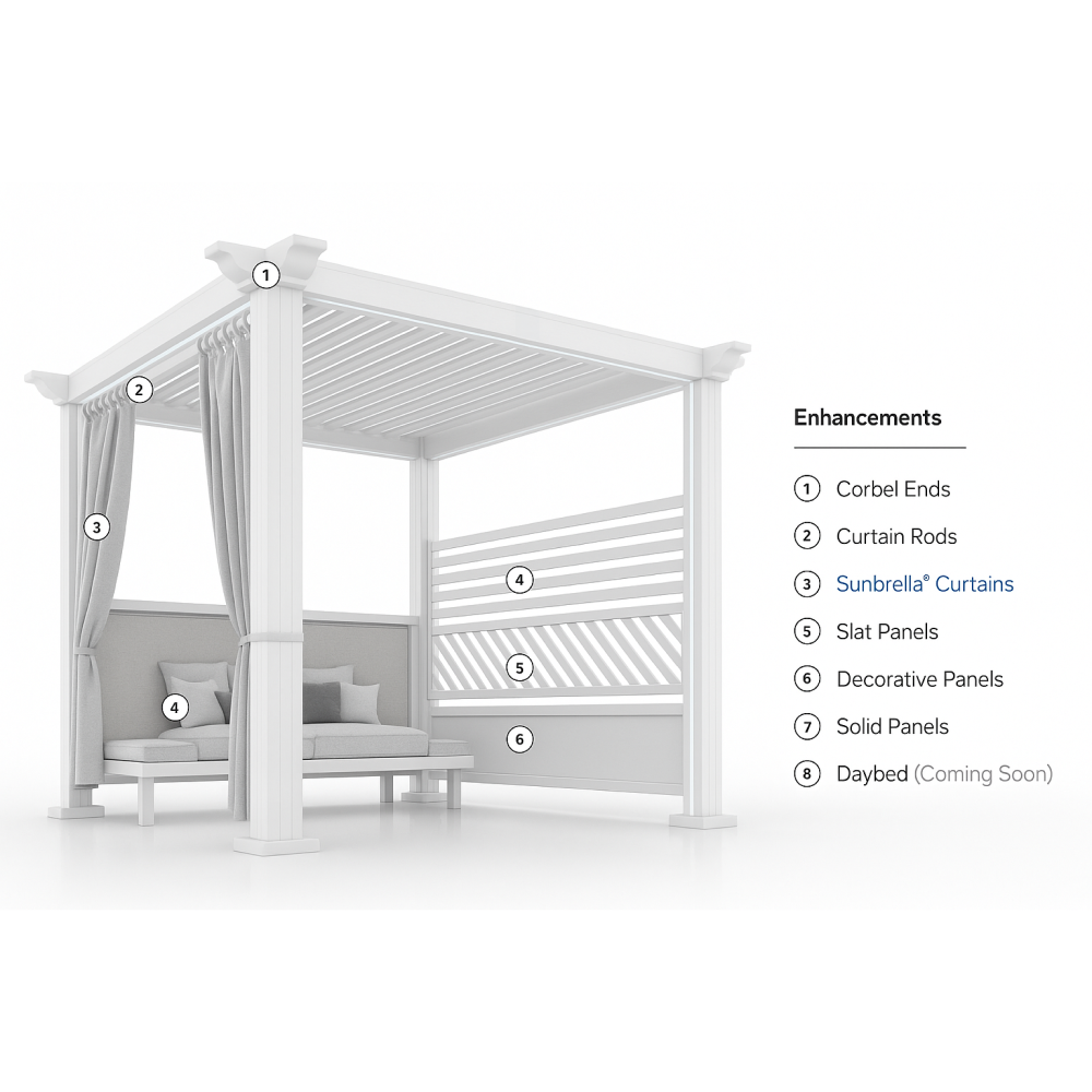 From captivating color choices, including rich woodgrains, to the ambient glow of integrated RGBW LED lights in the posts and beams, Cabana X adds an enchanting dimension to your property’s ambiance.
